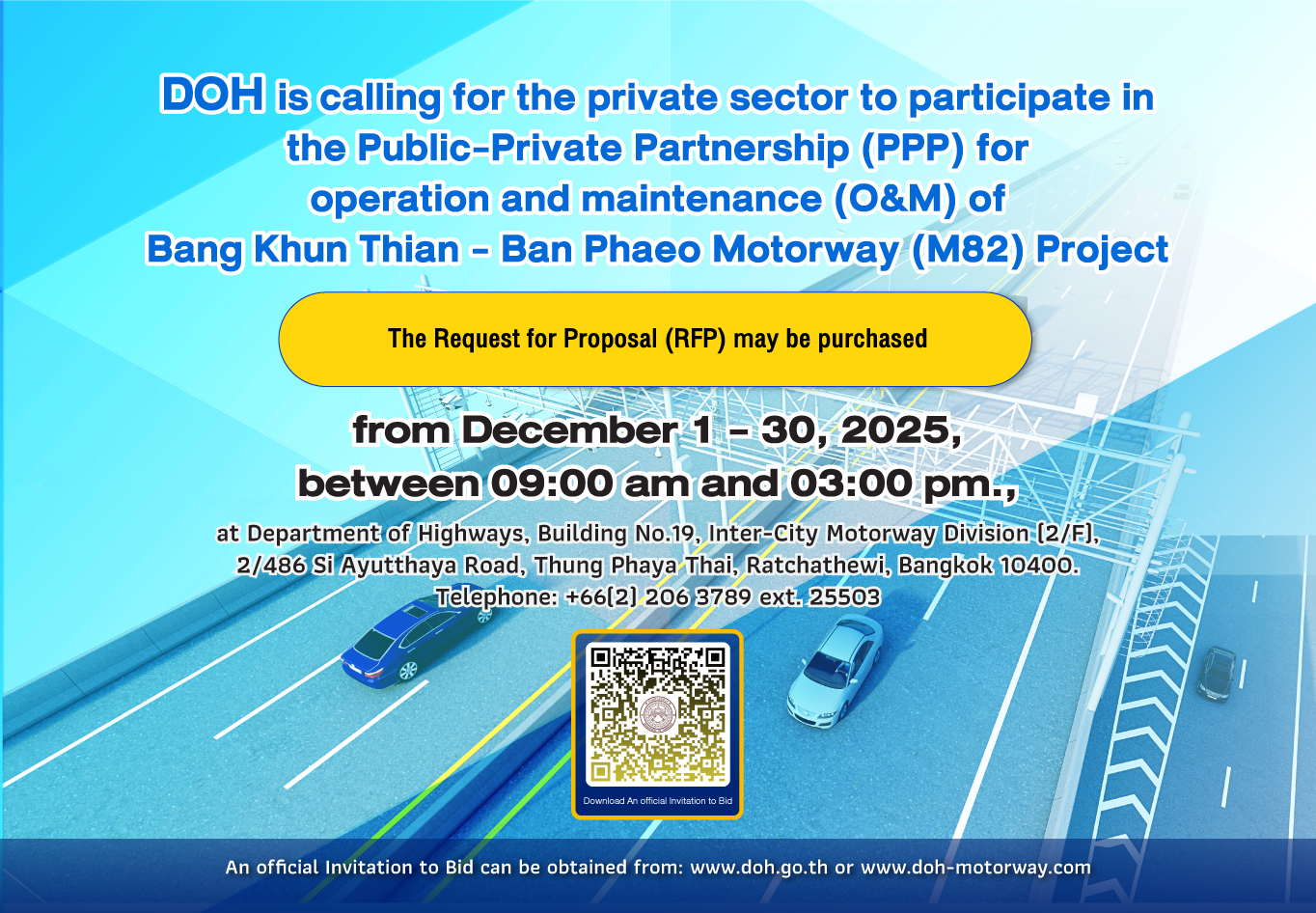 The Department of Highways is calling for interested private entities to participate in the Public-Private Partnership (PPP) for operation and maintenance (O&M) services of the Bang Khun Thian – Ban Phaeo Motorway (M82)